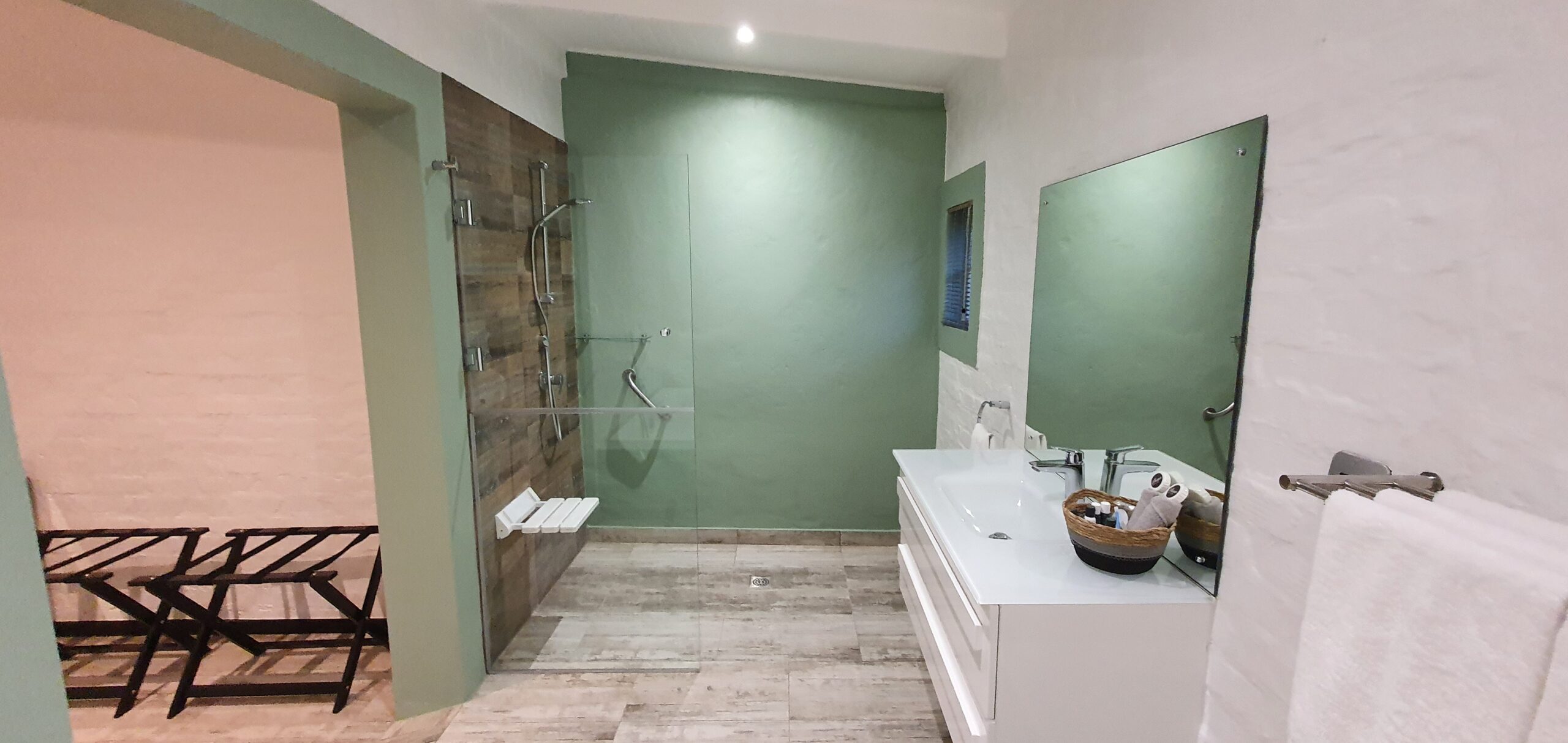 This suite sleeps 2 people and is designed in a hotel-style layout, featuring a double bed/twin, kitchenette, en-suite bathroom and free WiFi. Beds can be converted to twin or double beds. Each room has its own private entrance as well as a patio to enjoy the picturesque mountains and wildlife. The bathroom has a bathtub and a seperate walk-in shower.